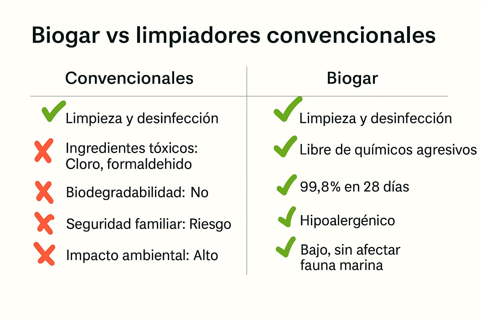 Biogar limpia y desinfecta sin Cloro, Nuestros productos eliminan virus, bacterias y hongos con ingredientes activos como alcohol vegetal y tensioactivos. Son 99.8 % biodegradables en 28 días, seguros para tu familia y no dañan el mar ni a sus animales.